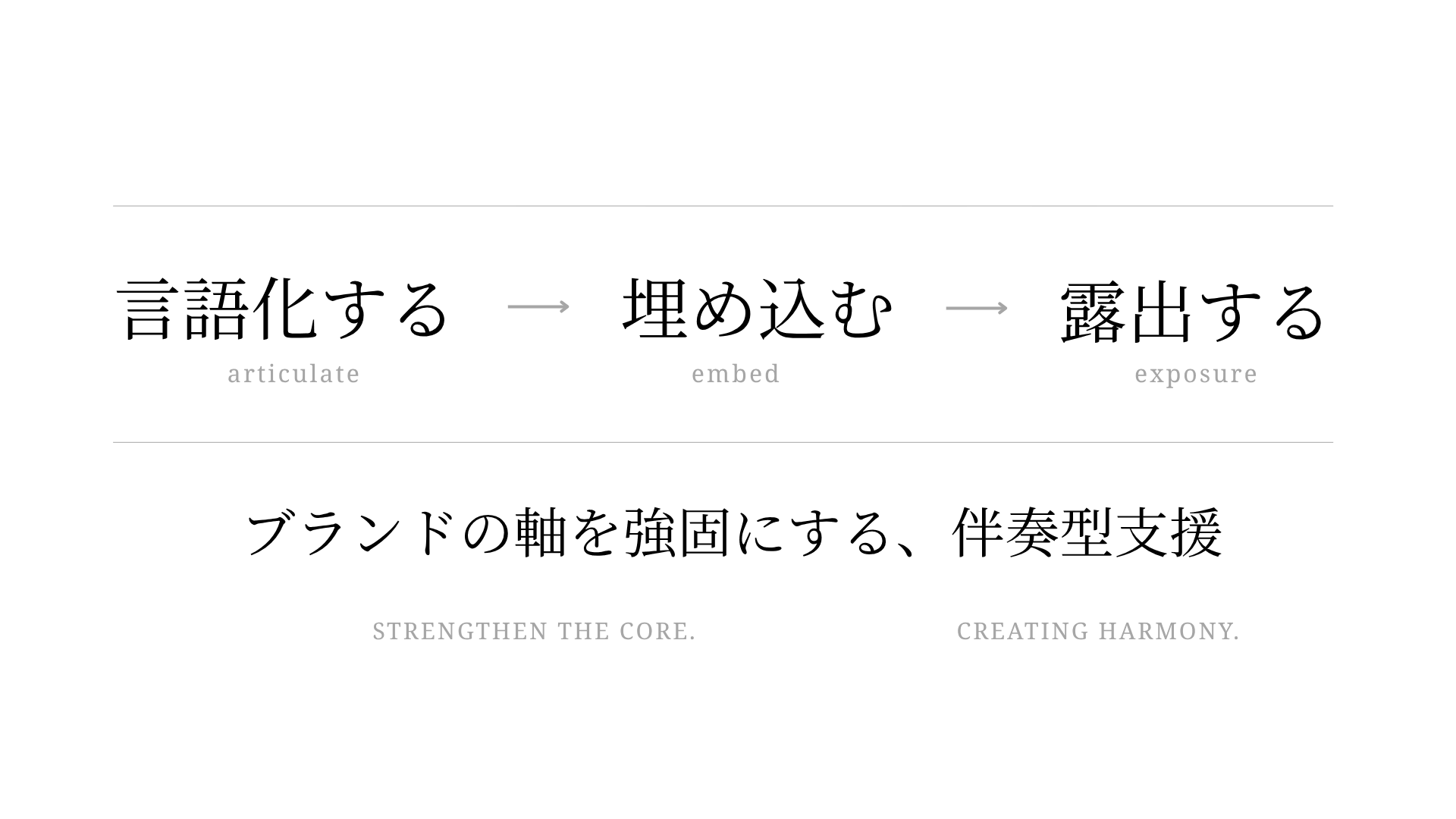 ブランディングは作ったところから始まり、 社内外に浸透することを目指します。 ダズリールーは組織に深く関わることで、社内にブランドマインドを浸透させ、報道などの第三者評価を得ることでブランド軸を強固にしていくまで伴奏します